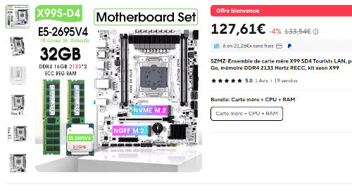 - un kit CM + CPU + RAM avec 18 cores/36 threads et 32Go de ram (126€)