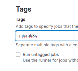 Je vous conseille de mettre un tag spécifique (Ici “microk8s”) et de laisser “run untagged jobs” décoché pour que les runners partagés et gratuits de gitlab.com fasse la majorité du boulot