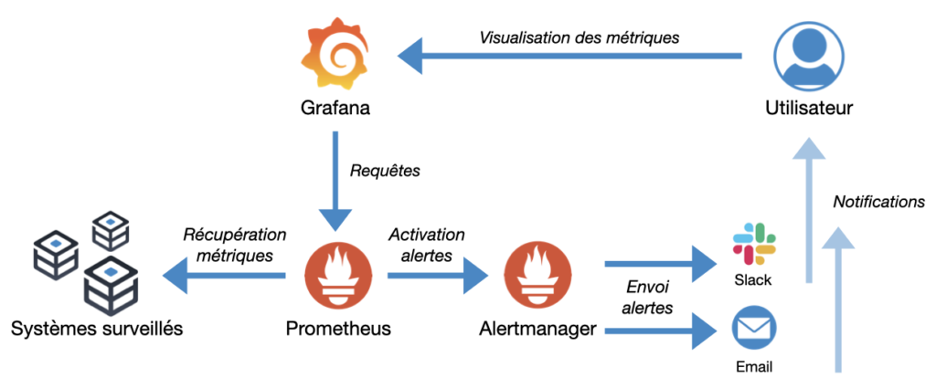 Comparativement au schéma ci-dessus, nous nous limiterons à Prometheus et Grafana, alertmanager et les différents canaux d’alerting pouvant être rajoutés par la suite.